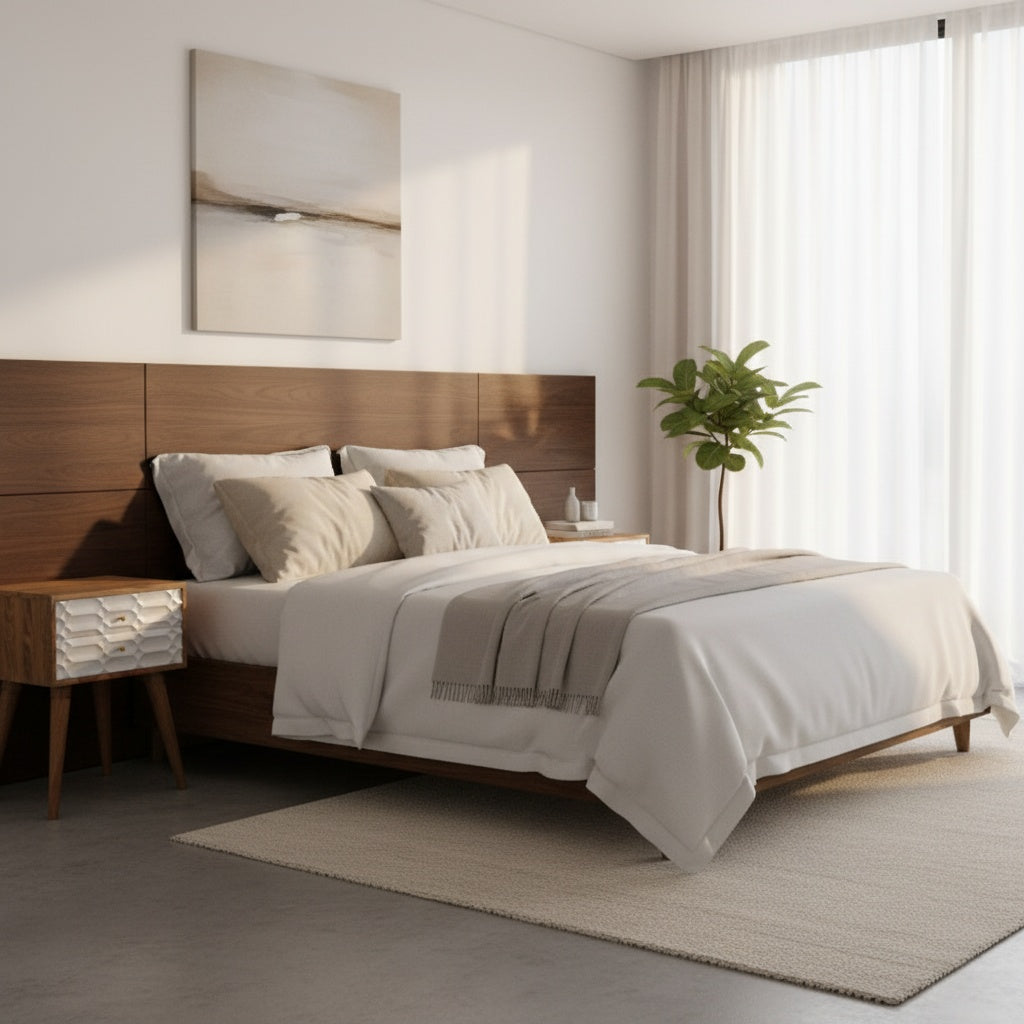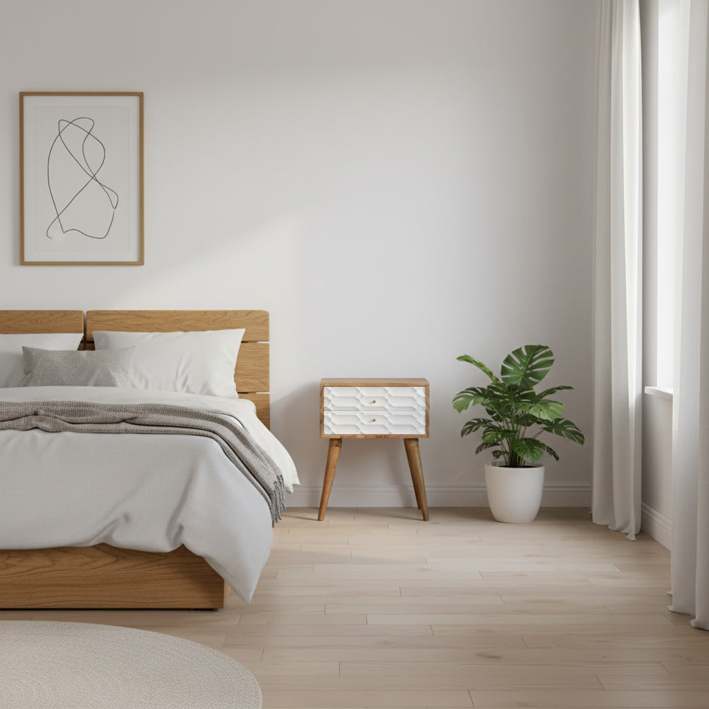 Elevate your bedroom with this sophisticated mid-century modern nightstand featuring eye-catching white geometric carved drawer fronts and warm natural wood construction. Two spacious drawers provide ample storage while the distinctive diamond-pattern design adds artistic flair to any space. Handcrafted with solid wood tapered legs and premium materials for lasting durability. Perfect as a bedside table, accent piece, or small storage solution. The clean lines and timeless design complement both contemporary and traditional décor styles.
