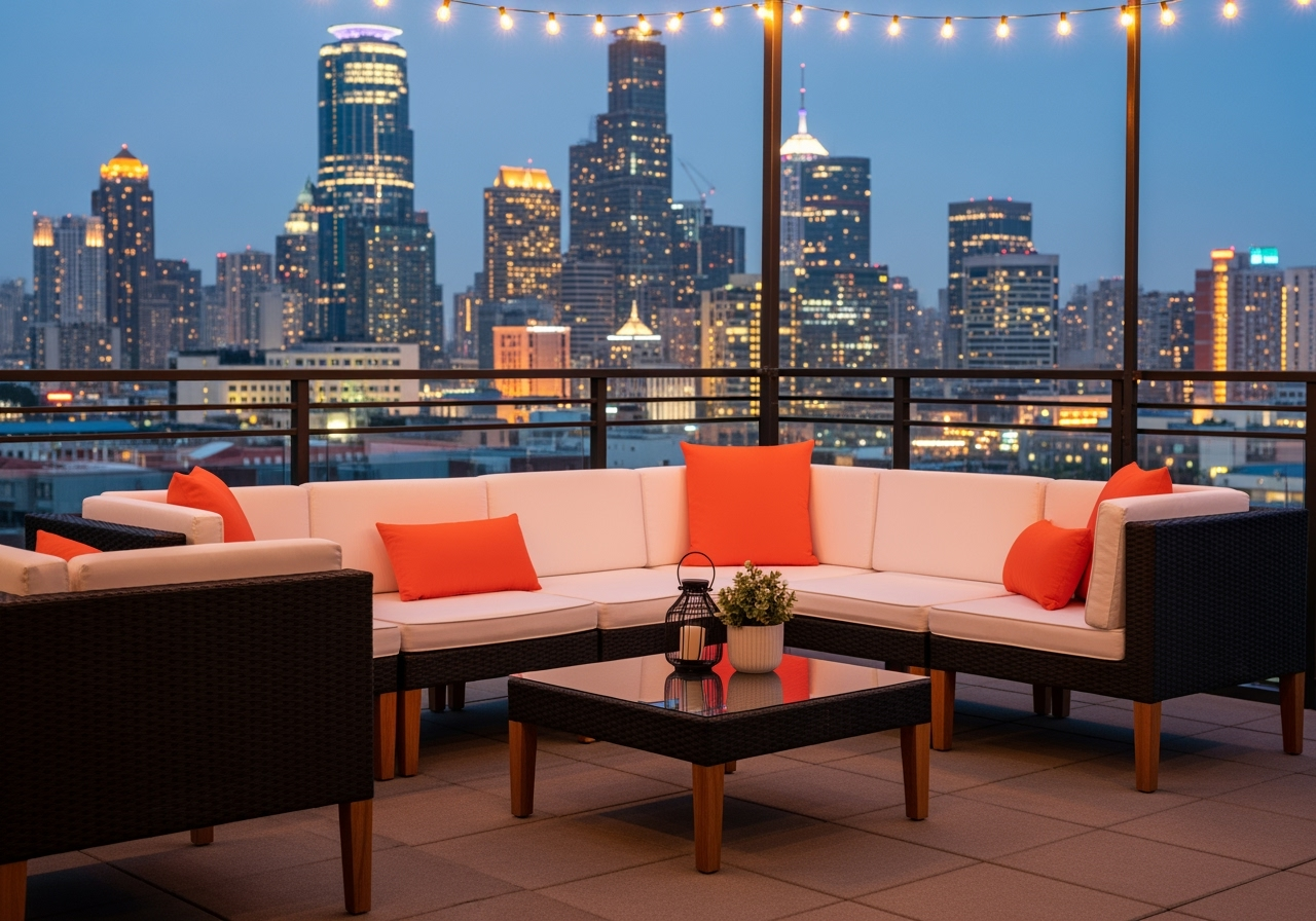 Elevate your outdoor space with this sophisticated 4-piece mid-century modern sectional set featuring dark wicker construction with elegant wood legs. The L-shaped sectional includes plush white cushions with vibrant orange accent pillows, creating the perfect balance of comfort and style. Matching glass-top coffee table with wooden legs completes the coordinated look. Weather-resistant wicker construction ensures durability while the mid-century design adds timeless appeal. Perfect for poolside entertaining, deck relaxation, or creating a stylish outdoor living room.